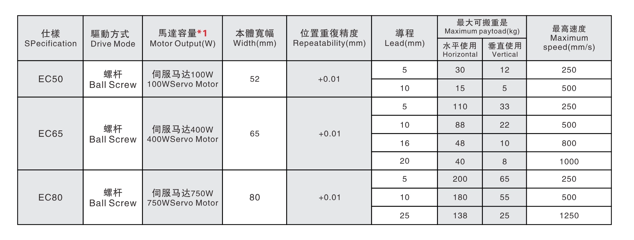 | 标准环境 | 滚珠丝杠 | EC 50 | 100瓦 | 52 | ±0.01 | 12 | 5 | 30 | 12 | 250 |
