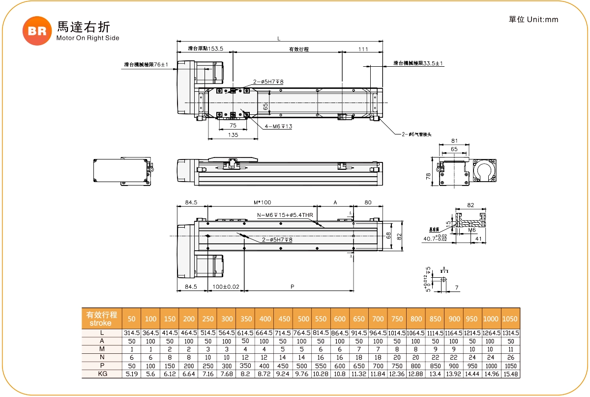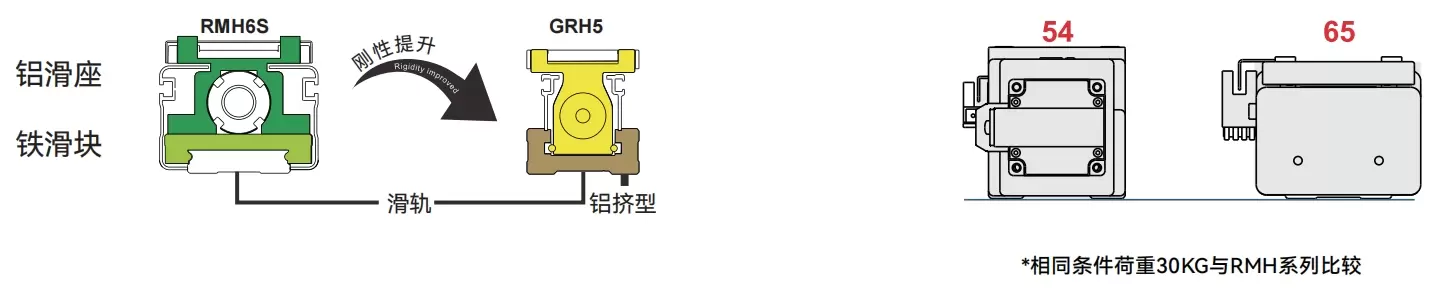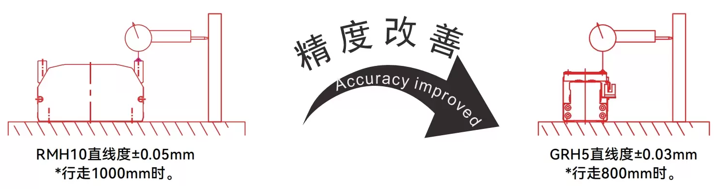 由于采用了铝合金机身结构,机身强度显著提高。与RMH5S/6S相比,钢轨嵌入铝合金机身内并经过研磨,从而将行走高度和直线度的精度提高到±0.02毫米以下(与RMH10/12相比)。