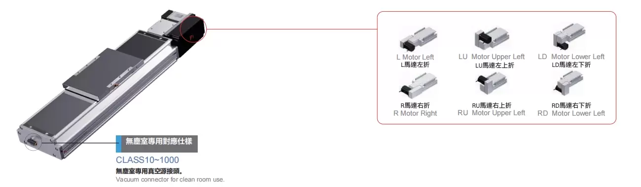 | 使用地点 | 驱动模式 | 型号规格 | 减速器机构 | 电机输出 (w) | 宽度(毫米) | 机身高度(毫米) | 重复性 (毫米) | 皮带规格 | 最大有效载荷(千克) | 最高速度 (毫米/秒)*1 | ||
