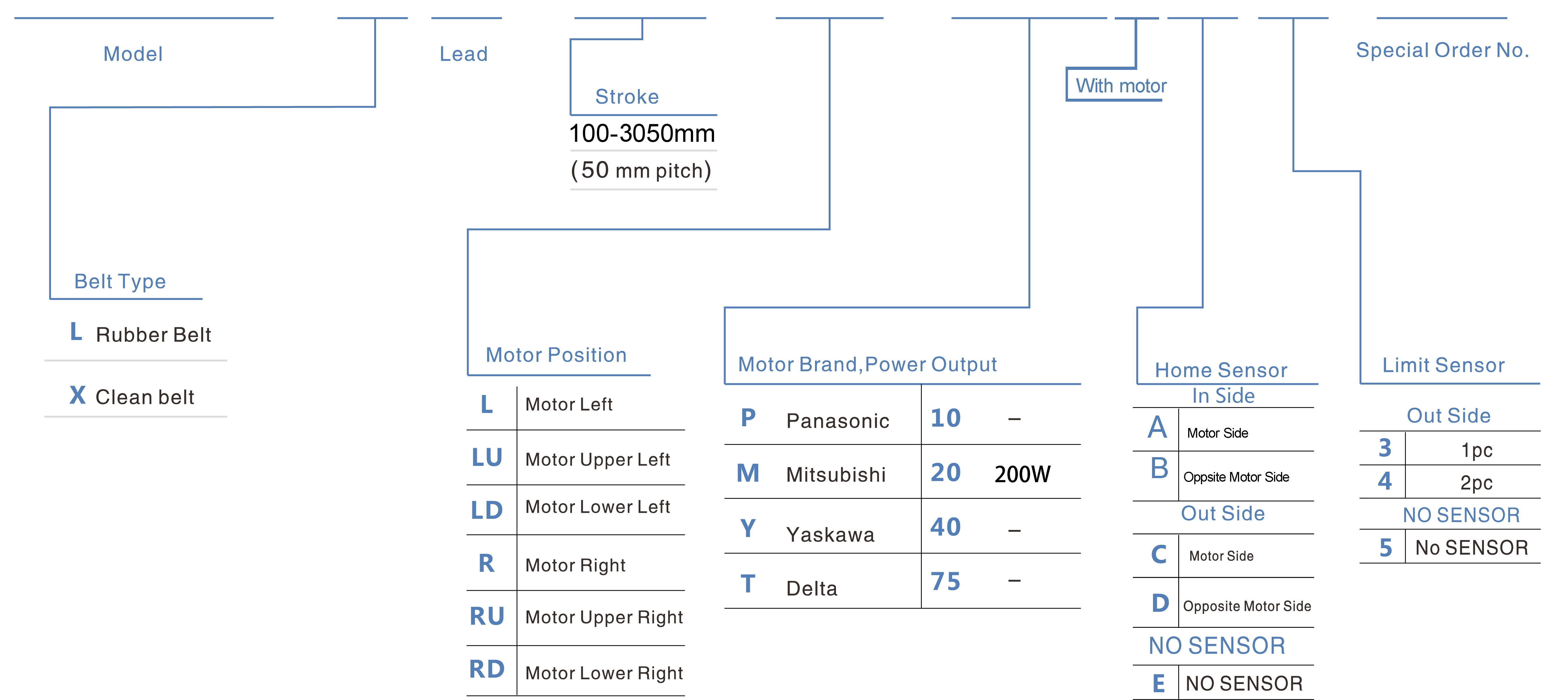 | 使用地点 | 驱动模式 | 型号规格 | 减速器机构 | 电机输出 (w) | 宽度(毫米) | 重复性 (毫米) | 皮带规格 | 最大有效载荷(千克) | 最高速度 (毫米/秒)*1 | ||