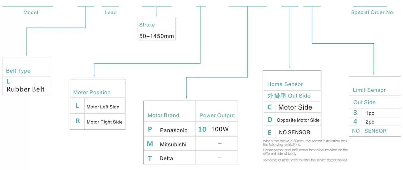 | 使用地点 | 驱动模式 | 型号规格 | 减速器机构 | 电机输出 (w) | 宽度(毫米) | 重复性 (毫米) | 皮带规格 | 最大有效载荷(千克) | 最高速度 (毫米/秒)*1 | ||