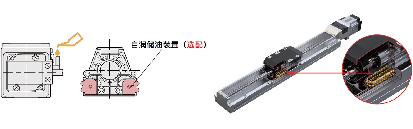 该系列产品无需拆卸外壳即可进行外部润滑。它采用特殊的钢带结构设计,配备自润滑油储存系统。
