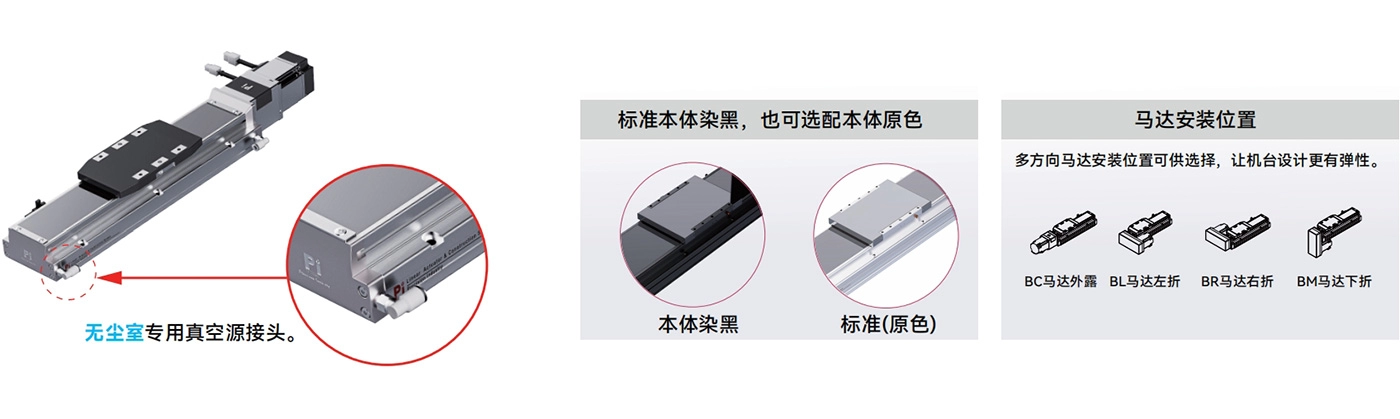 采用钢带防护,可防止异物直接落入滑台,减少粉尘产生;可在洁净室环境中使用,并可配备不同厂家生产的电机和安装方式。