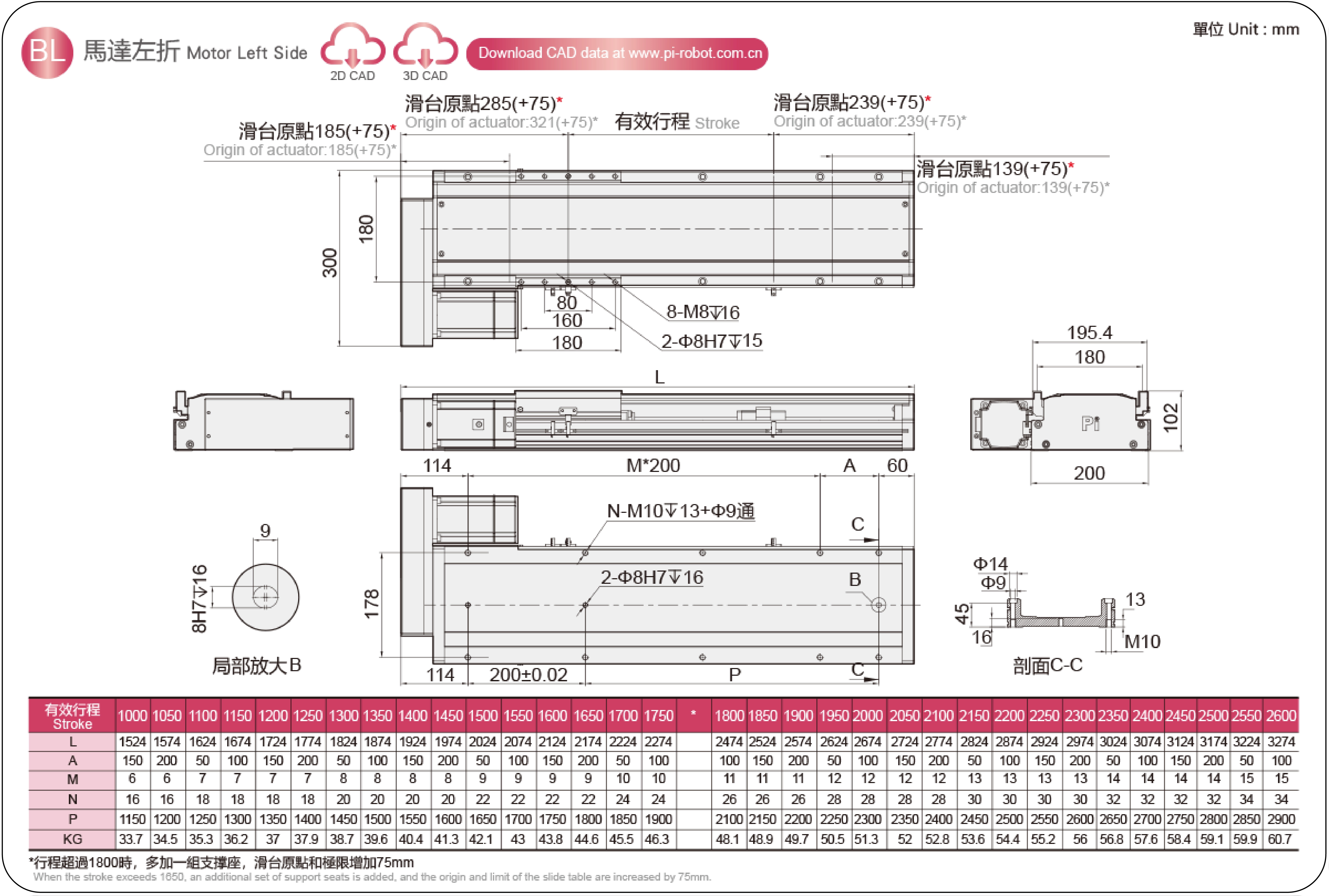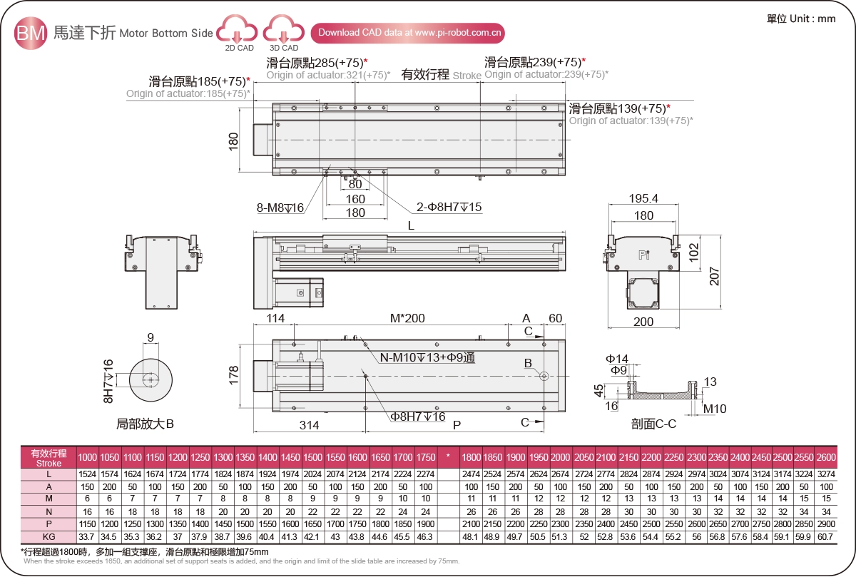 四柱滚珠丝杠嵌入式滑台,行程范围达 3000 毫米,最大速度达 2200 毫米/秒。