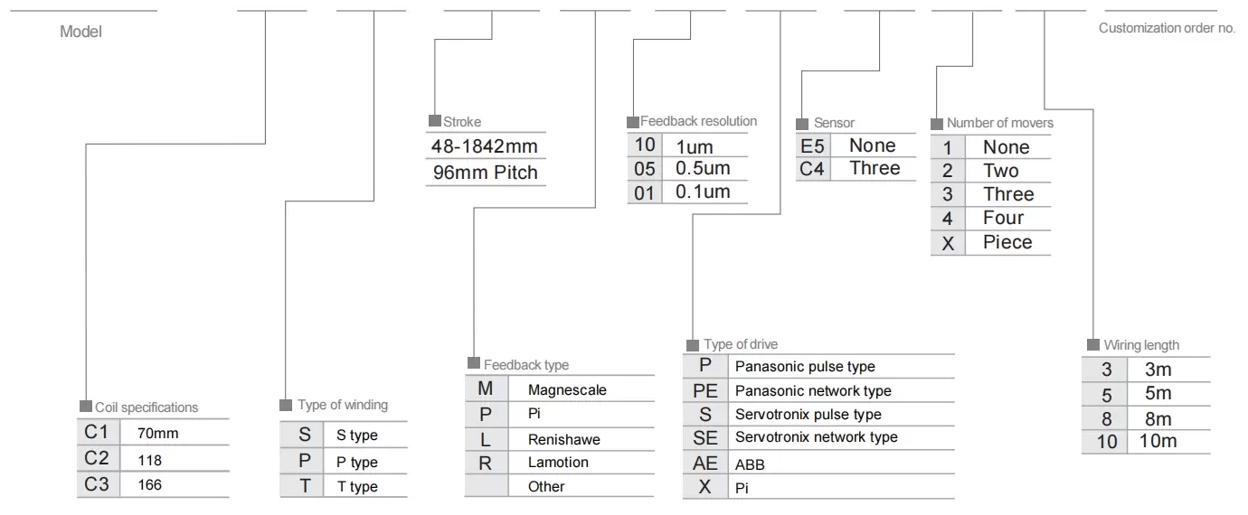 | 使用地点 | 驱动模式 | 型号规格 | 电机规格 | 主体宽度(毫米) | 身体高度(毫米) | 重复性(毫米) | 连续推力(N) | 峰值推力(牛顿) | lrms(A) | 最大有效载荷(千克) | 最高速度 (毫米/秒)*1 |