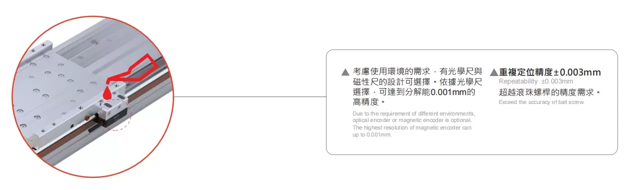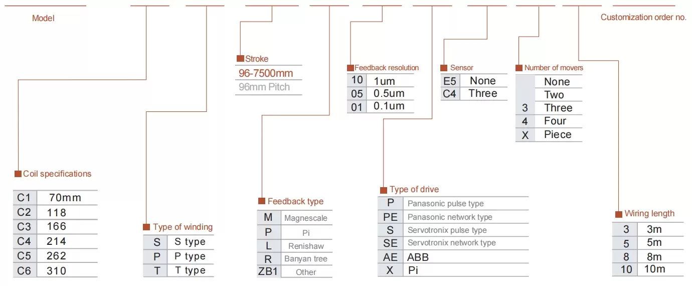 | 使用地点 | 驱动模式 | 型号规格 | 电机规格 | 主体宽度(毫米) | 身体高度(毫米) | 重复性(毫米) | 连续推力(N) | 峰值推力(牛顿) | lrms(A) | 最大有效载荷(千克) | 最高速度 (毫米/秒)*1 |