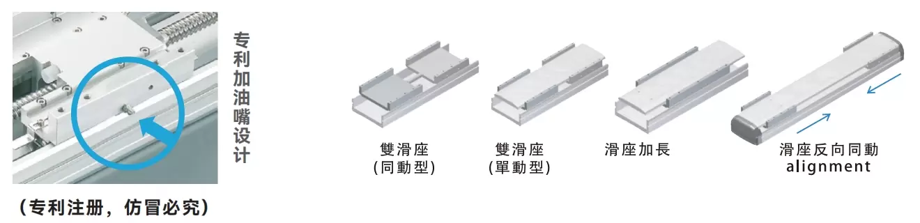 机身与滑块一体成型,改善了刚性不足的问题,并减小了宽度,从而缩小了设备的安装空间。业内独有的专利燃油喷嘴设计,采用滑块上的单个燃油喷嘴进行注油,可同时完成注油和螺母及多组滑块的维护,使您的维护更加便捷省时。燃油喷嘴的安装方向可根据客户需求选择。