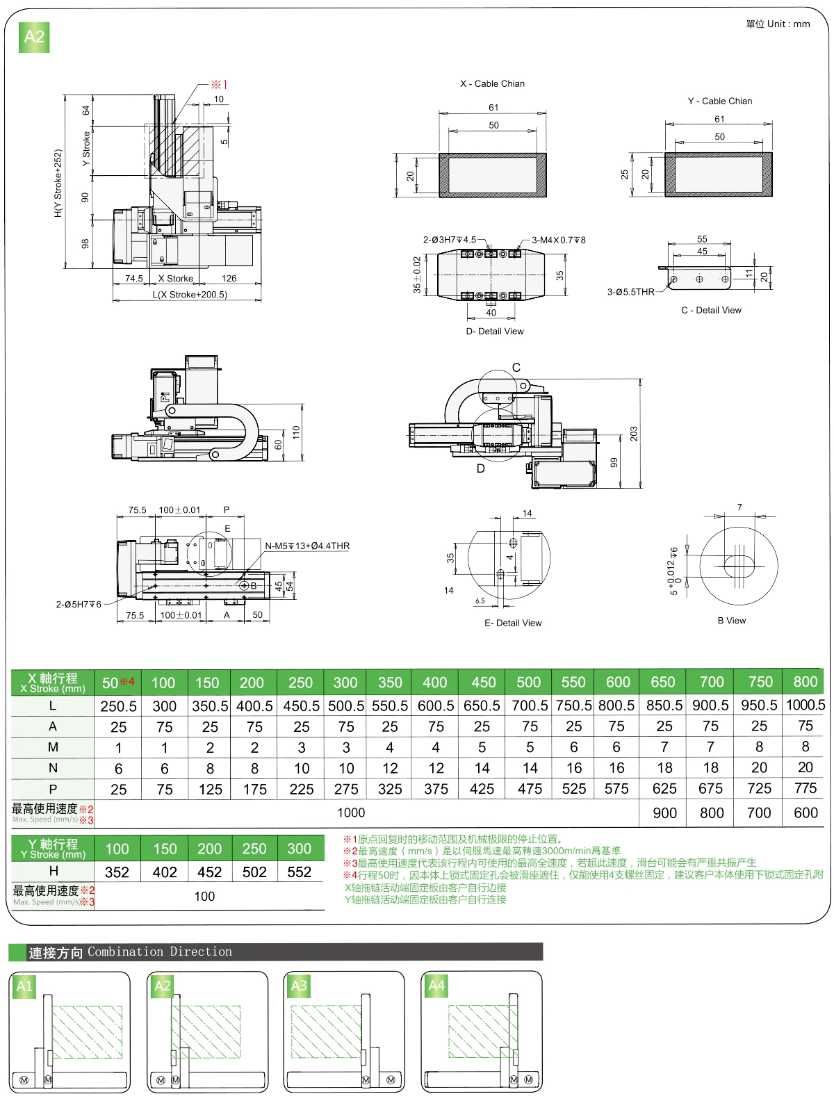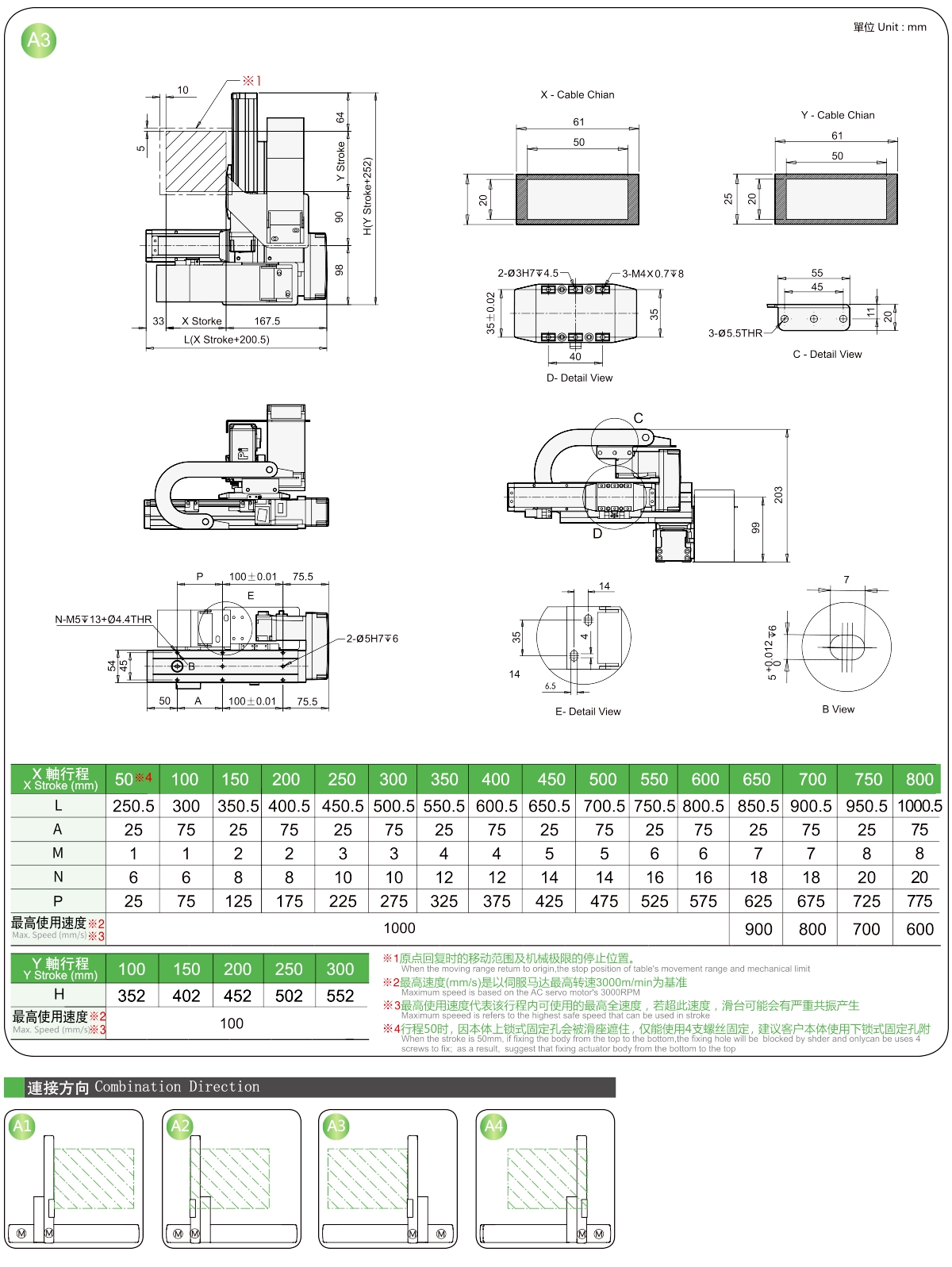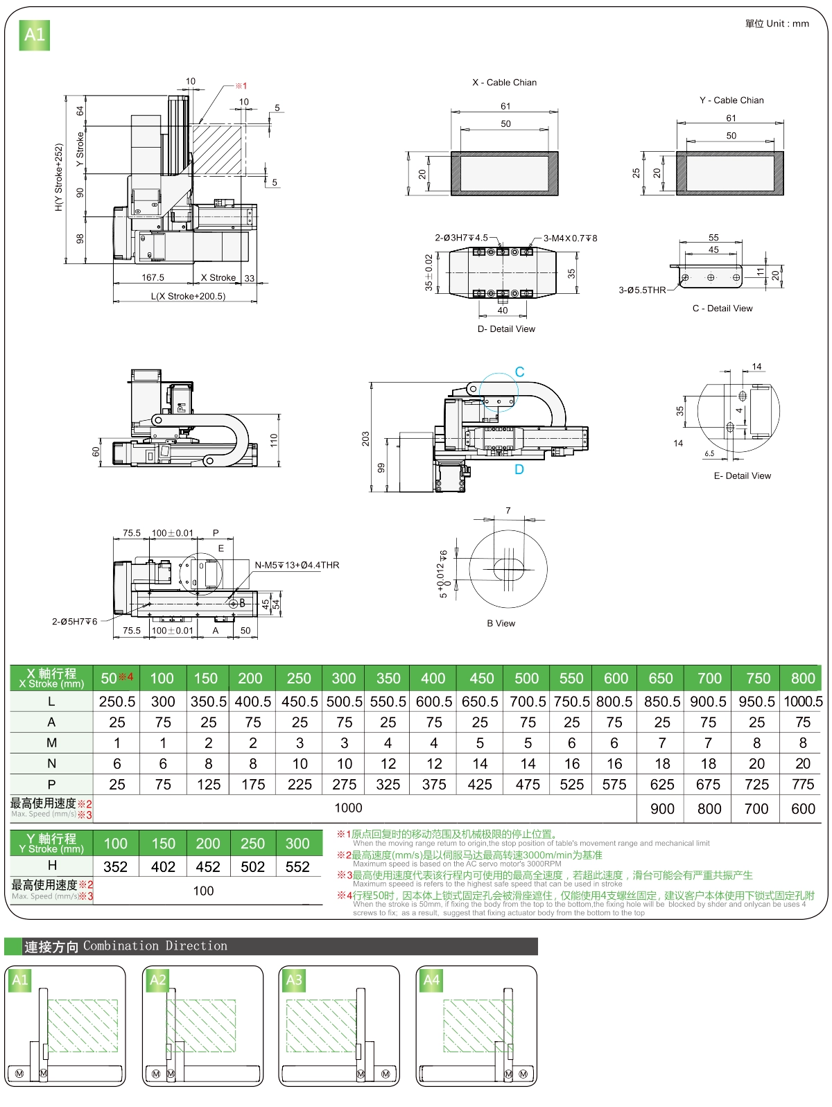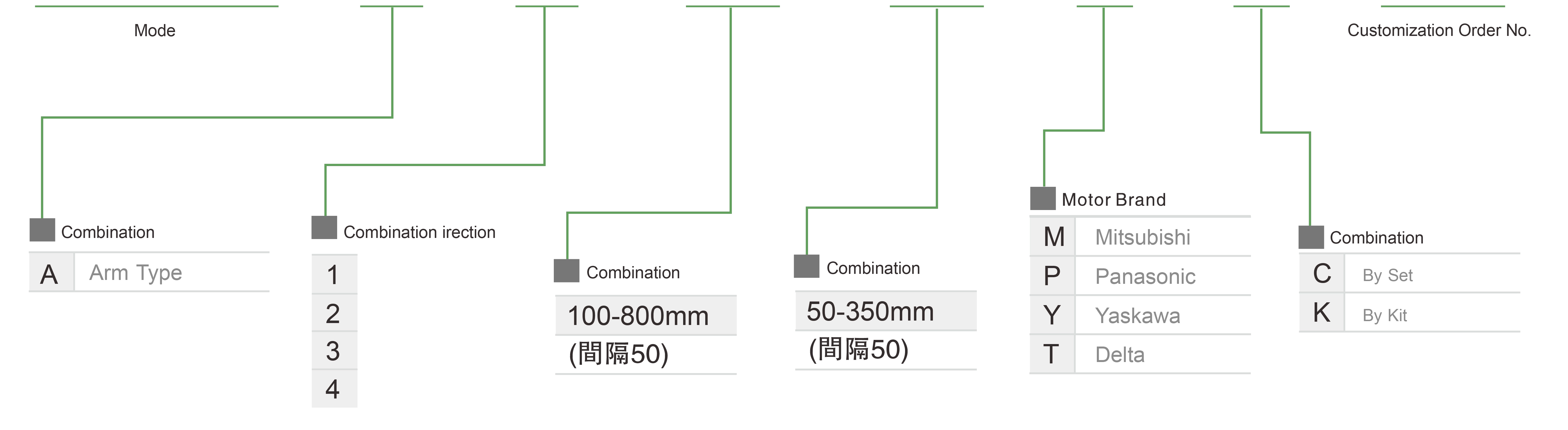 | 使用地点 | 驱动模式 | 型号规格 | 组合 | 轴编号 | 带领 | 最大速度(毫米/秒) | 行程(毫米) | ||||||