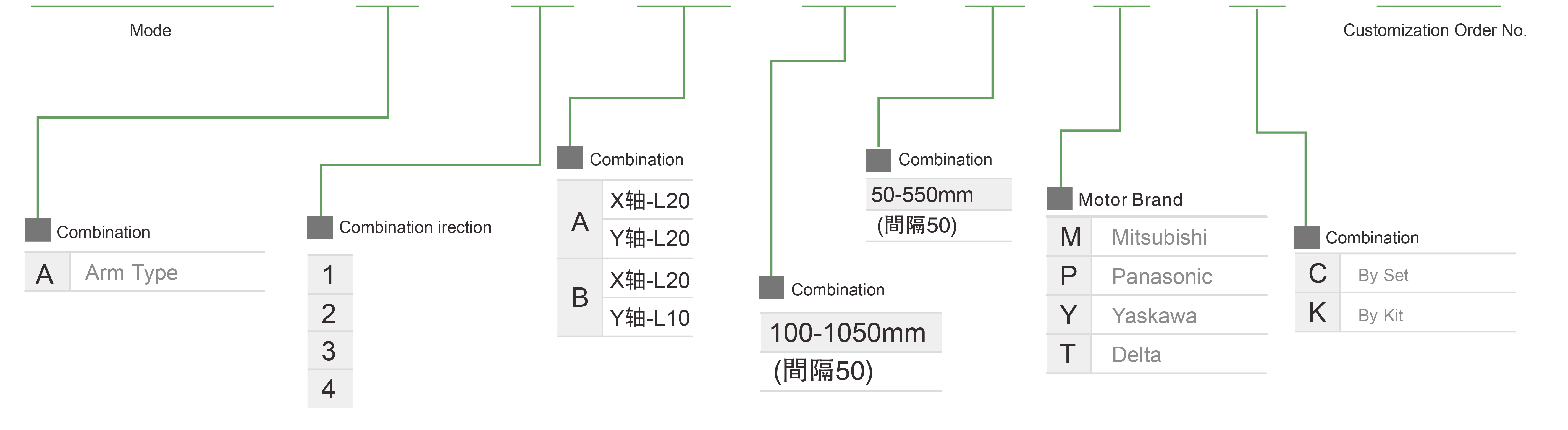 | 使用地点 | 驱动模式 | 型号规格 | 组合 | 轴编号 | 带领 | 最大速度(毫米/秒) | 行程(毫米) | ||||||