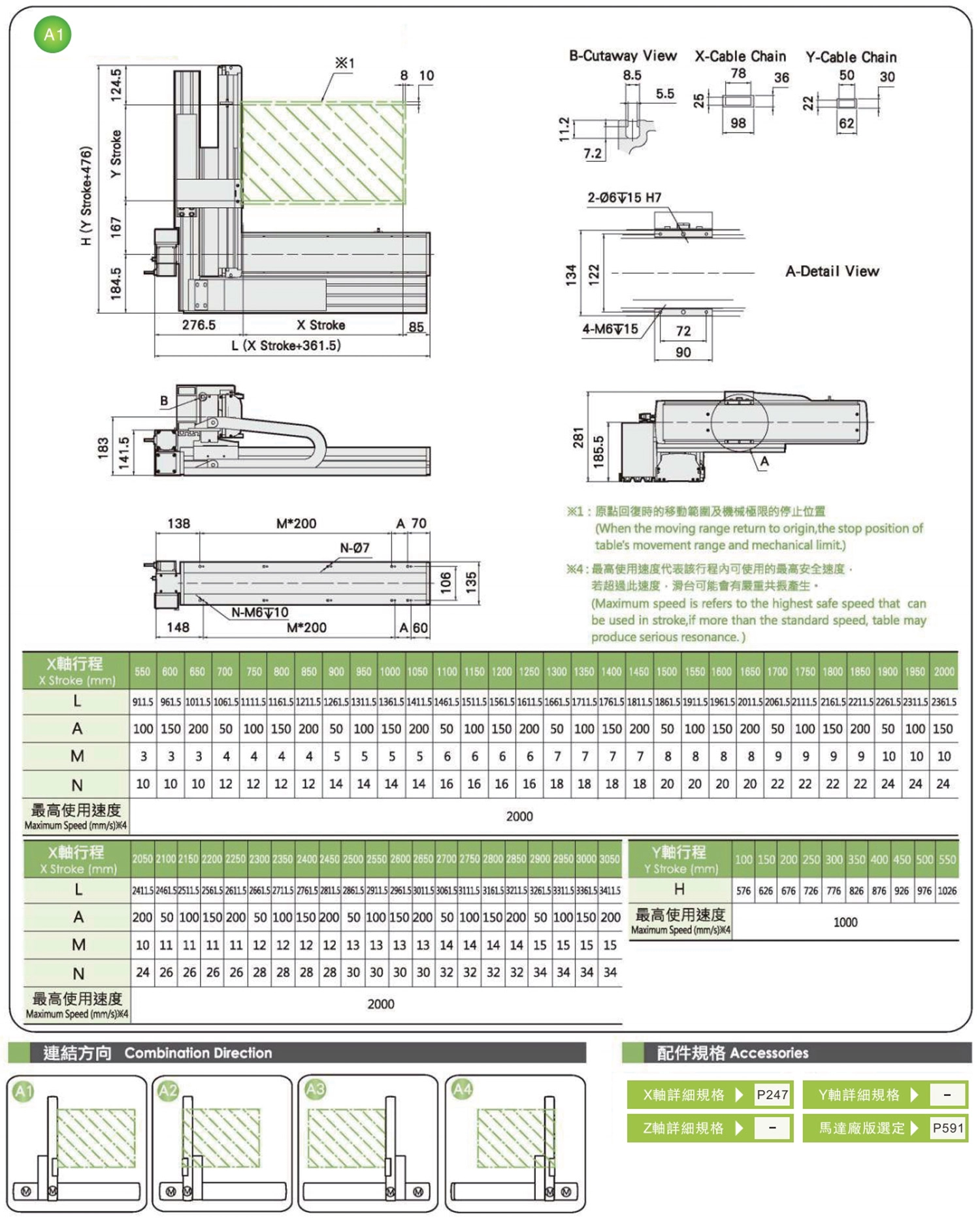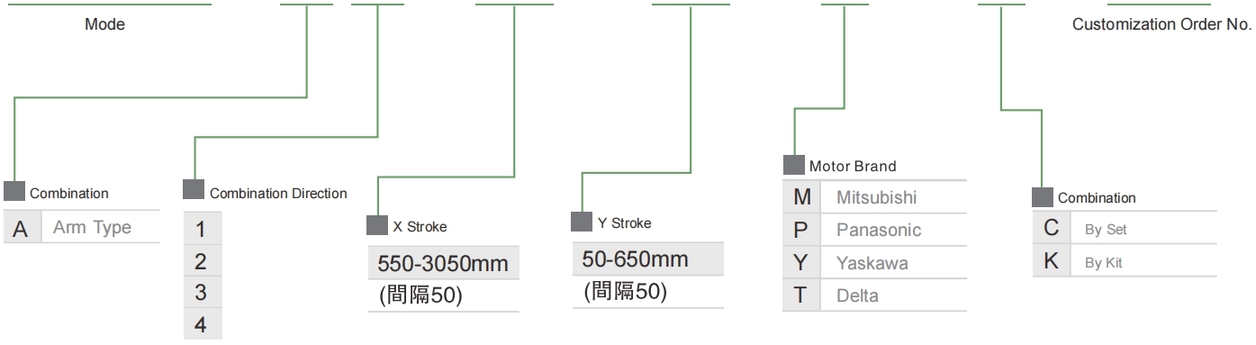 | 使用地点 | 驱动模式 | 规格 | 组合 | 轴编号 | 最大速度(毫米/秒) | 行程(毫米) | ||||